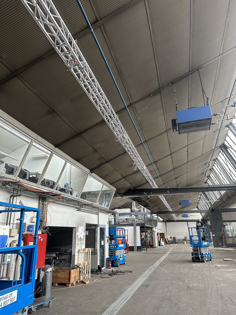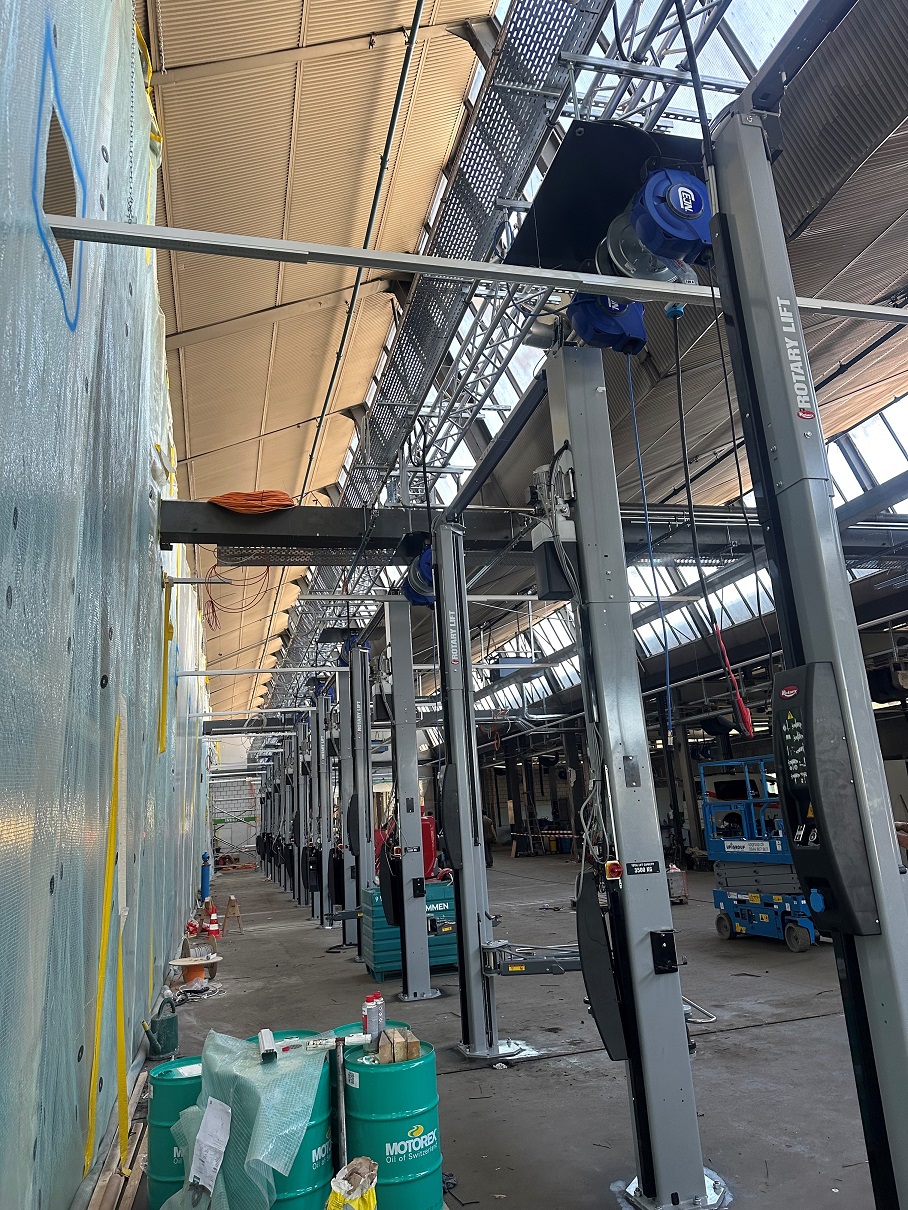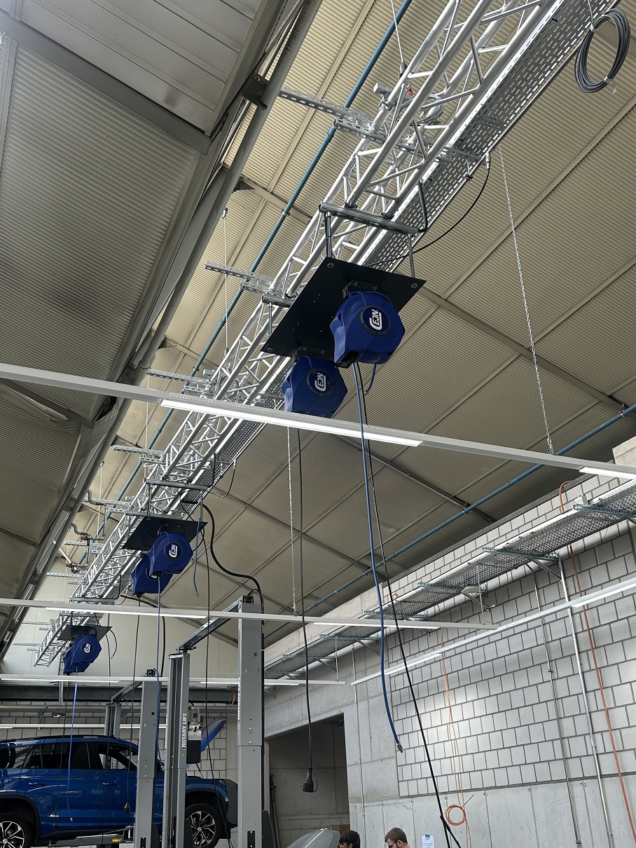 203m Alu Traversen durften wir für die AMAG Bern montieren. Die Werkstatt und Karosserie/Lackiererei werden einer umfassenden Renovation und Modernisierung unterzogen. An die Traversen werden Abroller für Druckluft, 12V Speisung, 230 V Anschluss für diverses Werkzeug montiert.